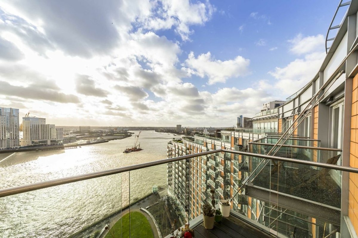 This 16th floor apartment enjoys spectacular river views from the generous reception room and balcony. There are two spacious double bedrooms, two bathrooms, wooden flooring, underfloor heating and a secure underground parking space.