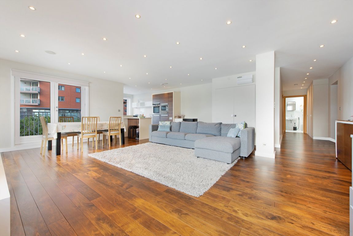 A bright and modern two bedroom apartment located in this sought after development. This river facing apartment has over 1200 square feet of internal space , Wooden flooring, a Juliette balcony and access to leisure facilities.