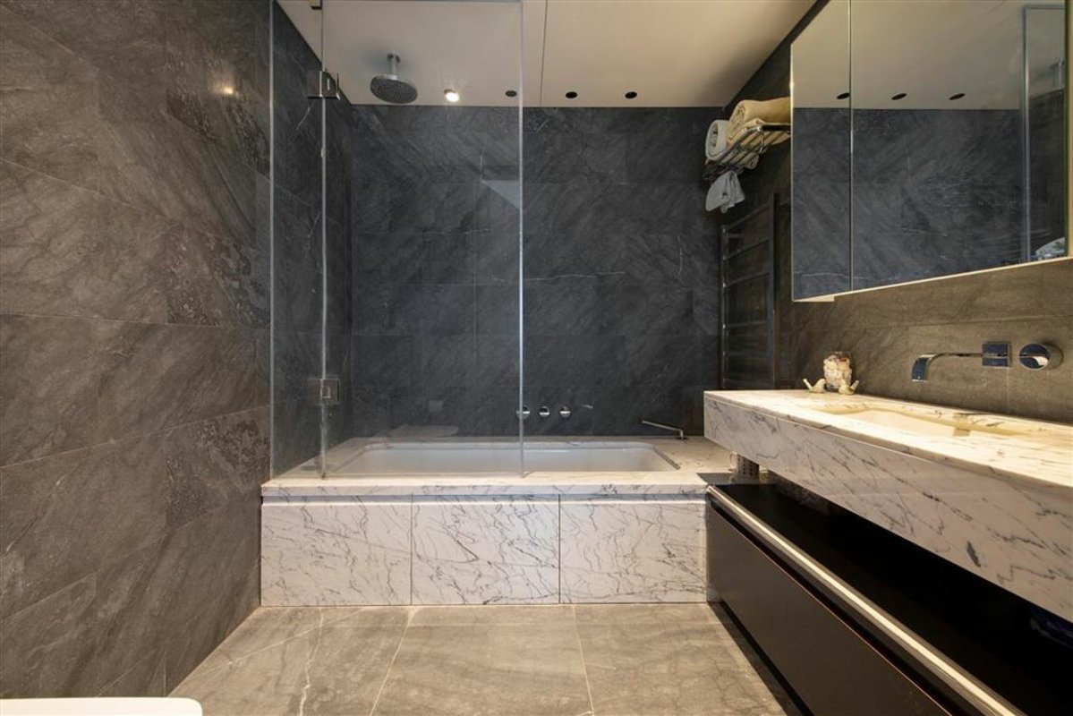 A pristine two-bedroom, two-bathroom apartment in Principal Tower. This apartment boasts high-end specifications and is part of a development that offers a 24-hour concierge, a fully equipped gym, a pool, a sauna, and a steam room, along with communal meeting areas.