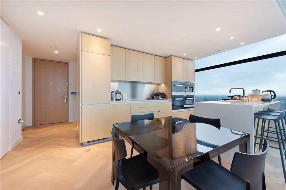 A pristine two-bedroom, two-bathroom apartment in Principal Tower. This apartment boasts high-end specifications and is part of a development that offers a 24-hour concierge, a fully equipped gym, a pool, a sauna, and a steam room, along with communal meeting areas.