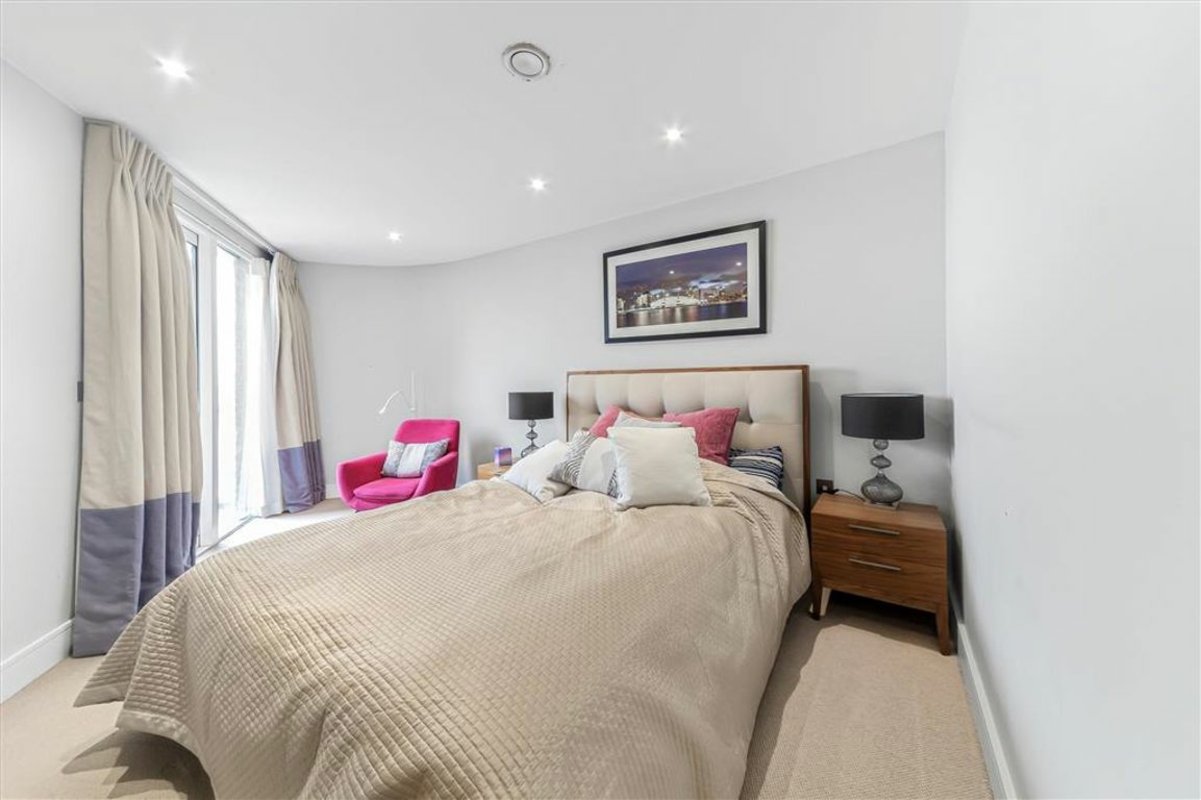 A two bedroom property on the 4th floor of Marc Brunel House. The property is 1250sq/ft and has an open plan reception with a modern fitted kitchen with an island, furnished to a very high standard, wood floors, two bedrooms, two bathrooms, balcony with river views.