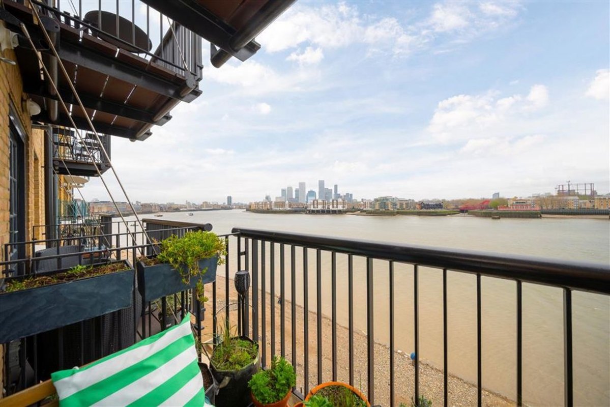 A one-bedroom, river-facing apartment in this sought-after development, spanning over 800 sq ft, comprising a large kitchen and living area, and a private balcony with views of the Thames.