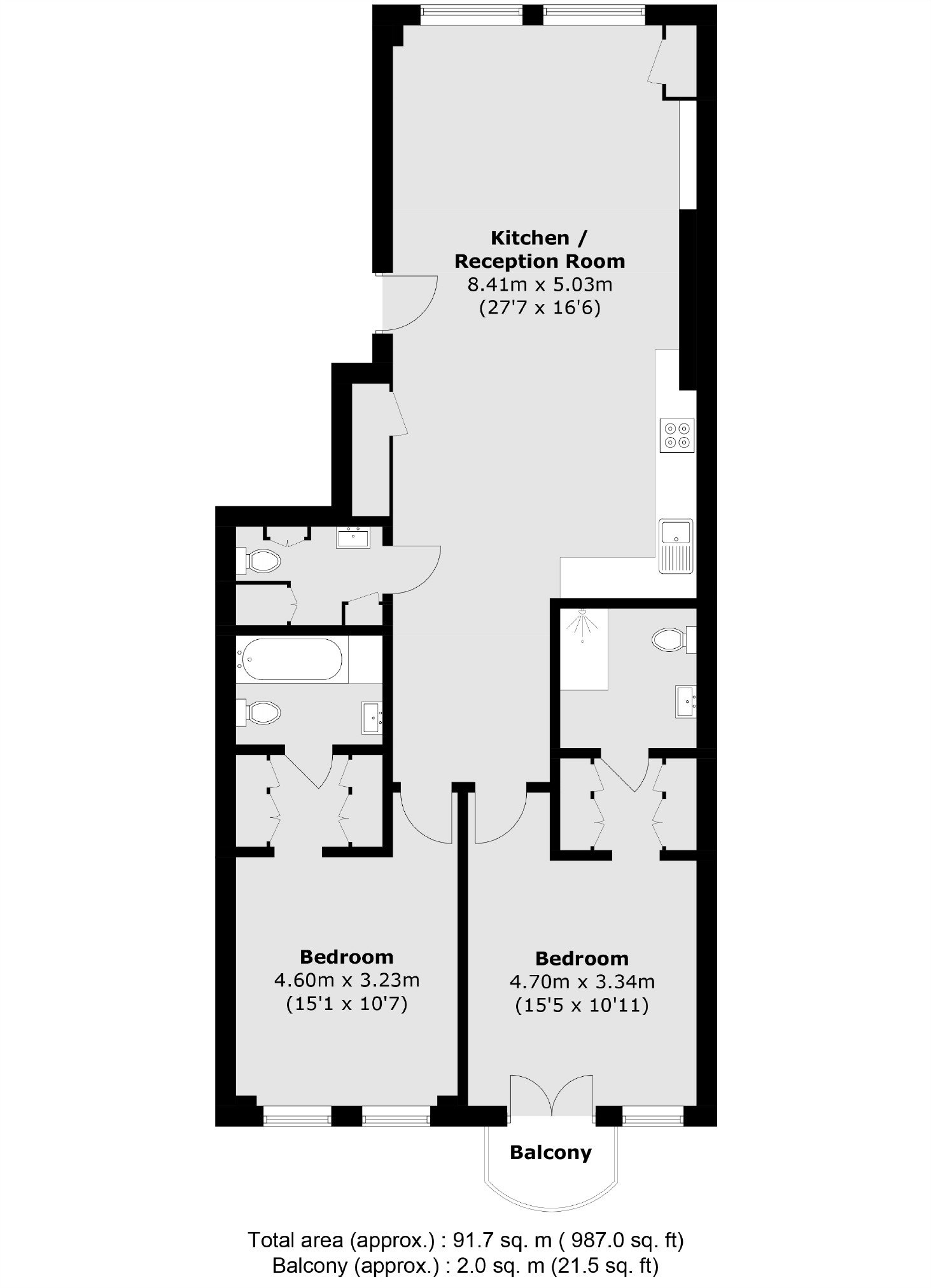 A two double bedroom lateral apartment located within a Victorian warehouse conversion. This property has been renovated throughout and comes with generous walk in wardrobes, two en suite bathrooms, a separate WC, and offers open plan living with dedicated space to dine.