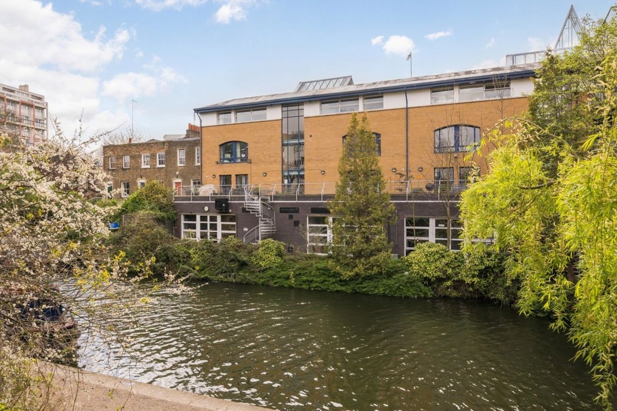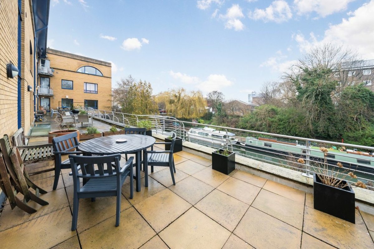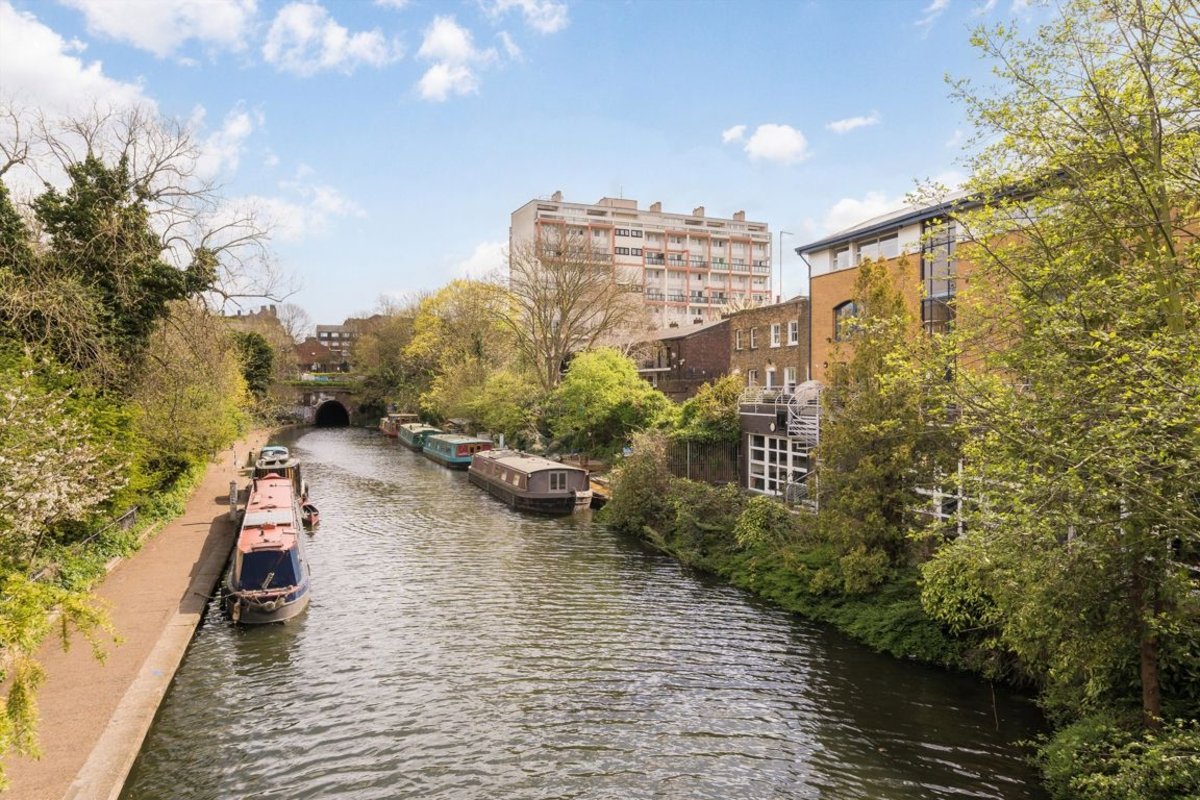 Located across the first and second floors, the accommodation comprises an open-plan kitchen/living area, three double bedrooms, a study, a family bathroom, and a large private terrace overlooking Regent's Canal. The property also includes private off-street parking.