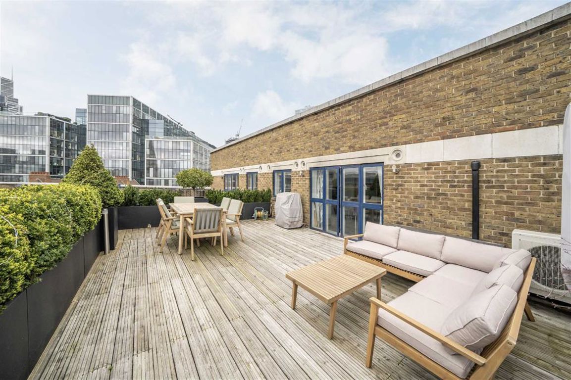 This top floor, two double bedroom, two bathroom apartment in the heart of Spitalfields. The apartment comprises a modern, open-plan kitchen/living room which leads onto a vast south-facing, private, terrace, only one of two in the block, two large double bedrooms, one with an en-suite and a contemporary family bathroom. Residents benefit from an on-site concierge and off-street parking.