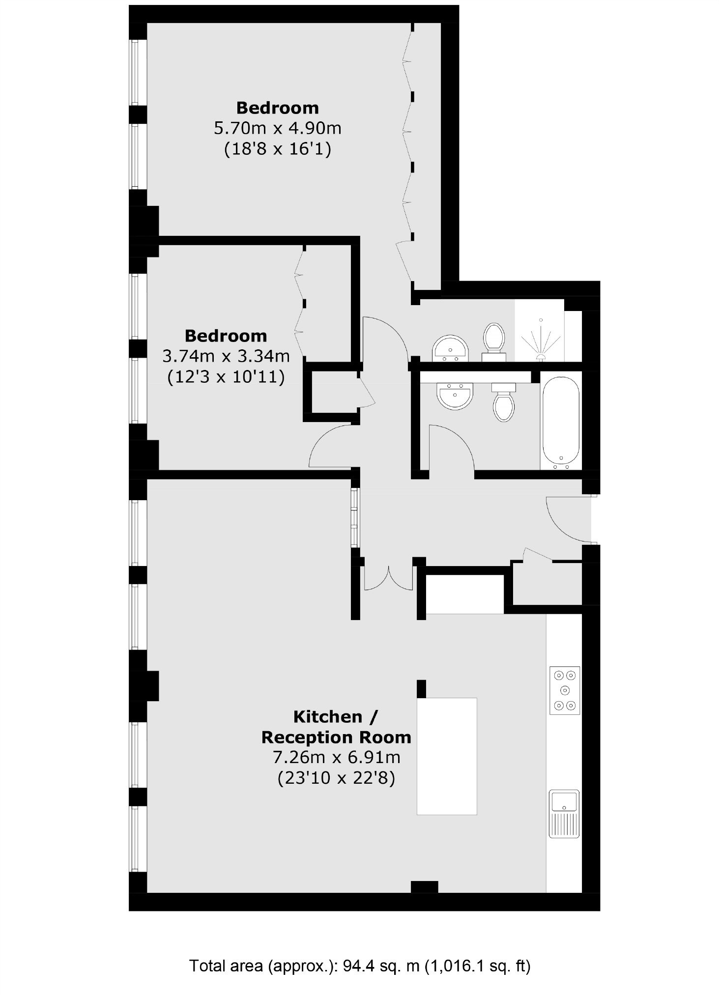 A very smartly presented Warehouse Conversion, with large sash windows and high ceilings, a spacious open plan kitchen and living room, two double bedrooms and two bathrooms, plus secure off-street, underground parking.