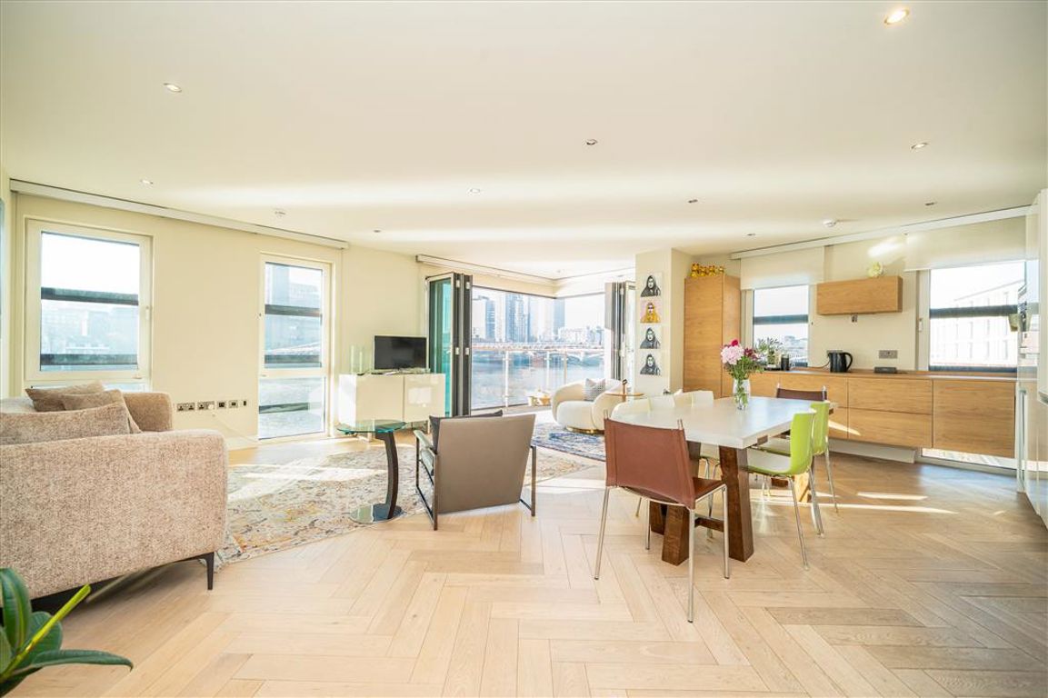 A well-presented, three double bedroom apartment with an unobstructed view of the Thames, located in Sir John Lyon House. The apartment has a large south-facing, dual-aspect reception room with bi-folding doors opening onto a private balcony with uninterrupted views of the River Thames, The Tate Modern, The Shard and the Globe Theatre. To the rear, the apartment has three double bedrooms, two with en-suite bathrooms and one guest bathroom. The property benefits from underfloor heating, comfort c...