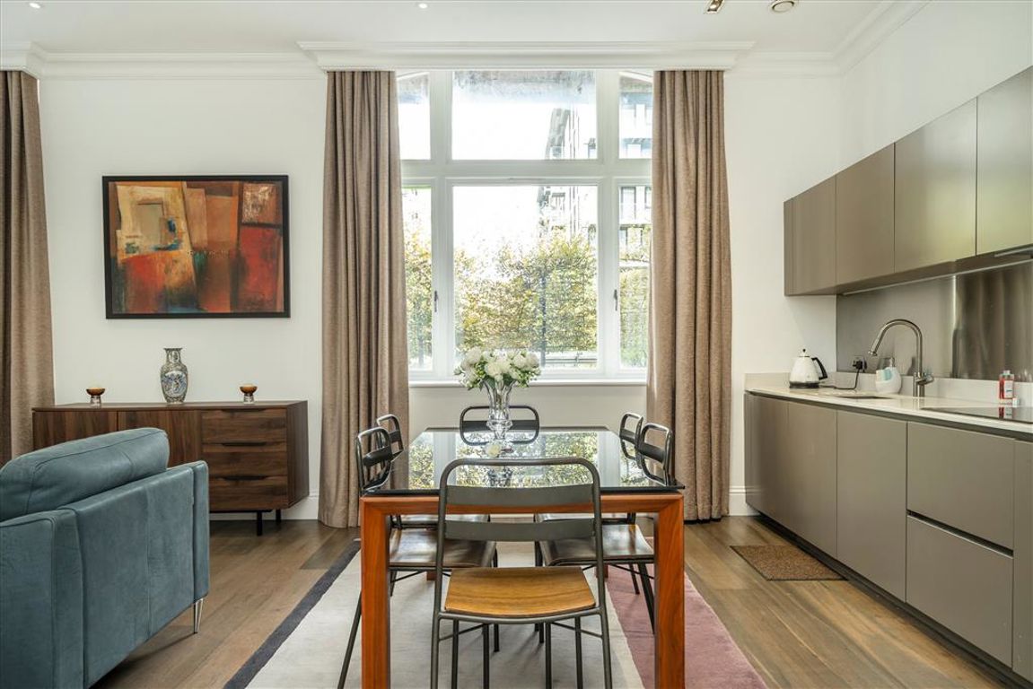 A well-presented two bedroom apartment located in Sterling Mansions. The apartment features a spacious open plan living and dining area with floor-to-ceiling windows, and a modern kitchen fitted with premium integrated appliances. Both bedrooms are generously sized, with the master bedroom including an en-suite bathroom, and have access to the large private patio. Residents benefit from a 24-hour concierge service, secure entry, and exclusive access to a private courtyard and residents' lounge.