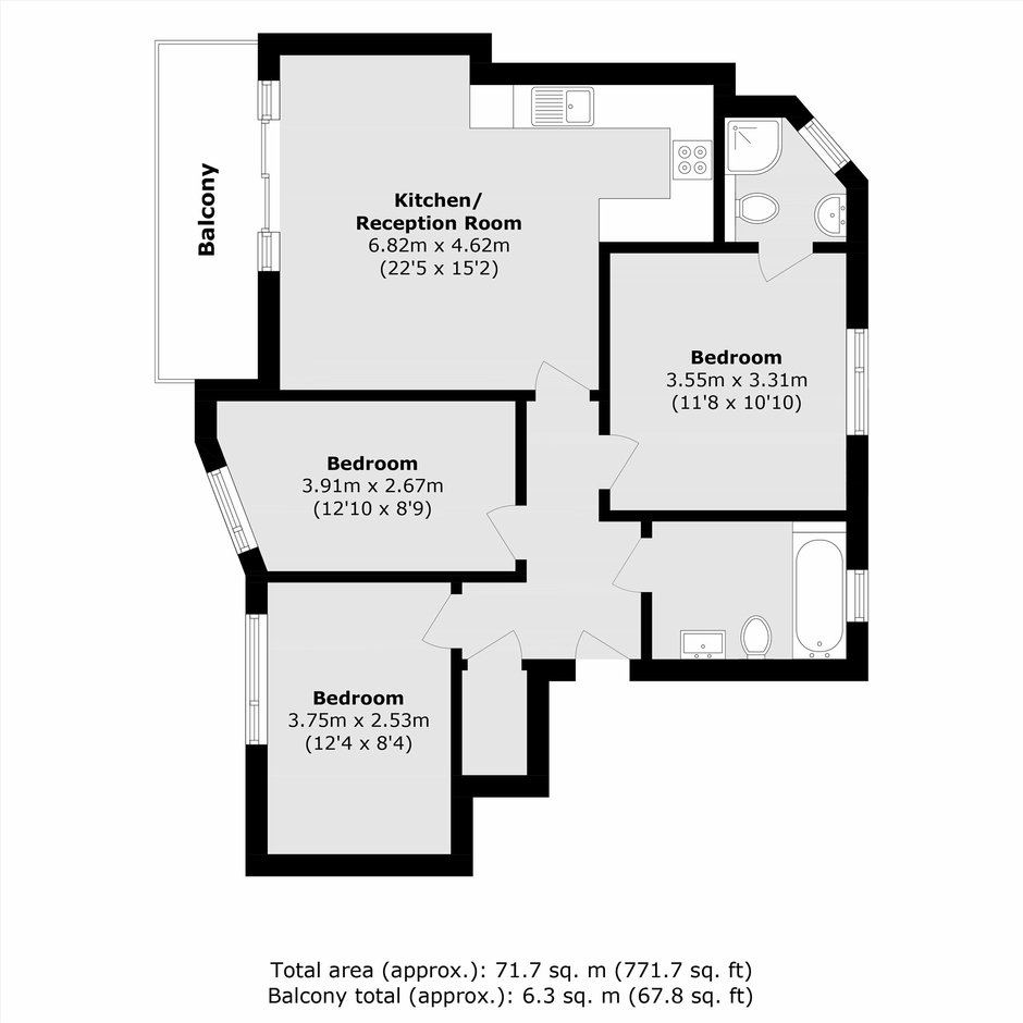 Three bedroom, two bathroom apartment that provides contemporary city living in a modern development. The apartment has a spacious open plan living room with ample space to dine and a fully integrated kitchen, this area leads out to the apartments private balcony. The apartment has three double bedrooms, the principle bedroom is en-suite. There is plenty of additional storage in the entrance hall as well as a modern family bathroom.