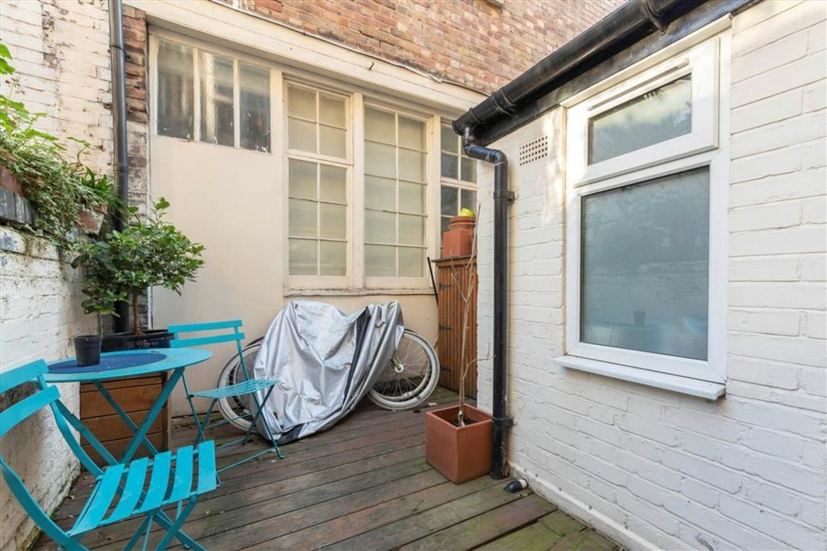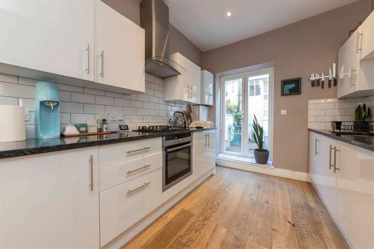 On the ground floor there is an open plan living and dining area with two large sash windows and stylish galley kitchen which comes with double doors leading out onto the courtyard garden.