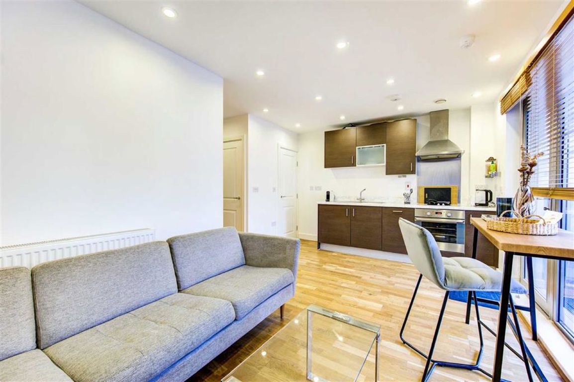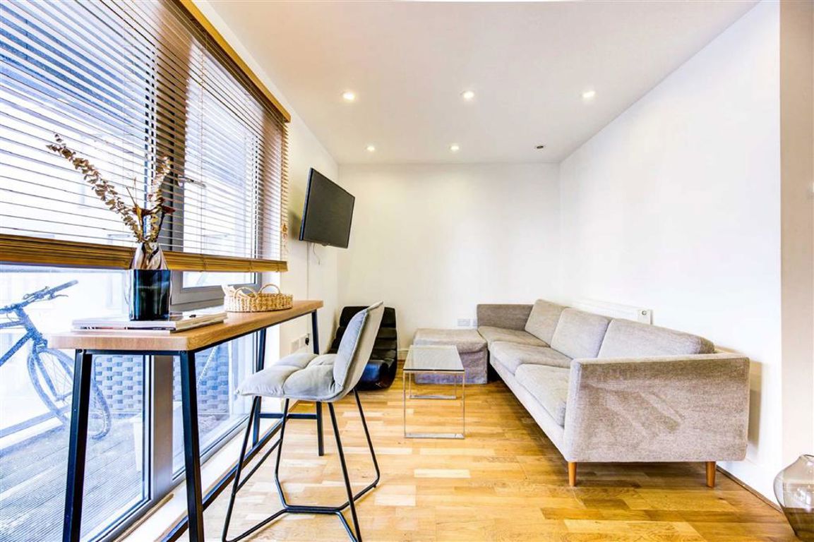 A bright studio apartment situated on the second floor. The property features a modern open-plan living and kitchen area with wooden flooring, leading onto a private balcony with courtyard views. There is a semi-separate bedroom area with built-in storage, floor-to-ceiling windows throughout, and a well-appointed family bathroom. Residents also benefit from access to an on-site gym and a day porter.